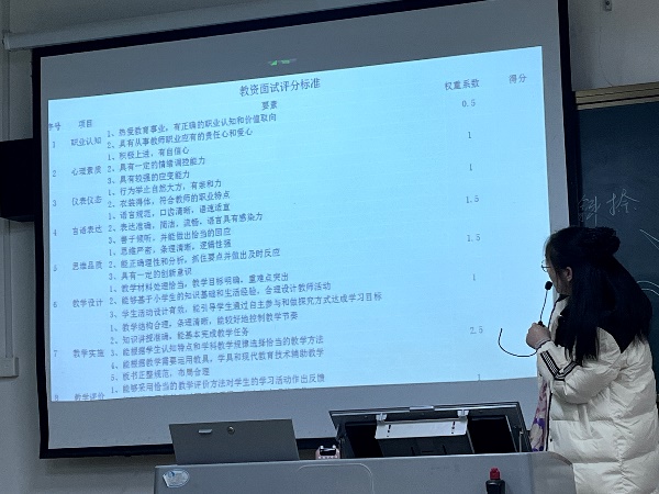 李主任首先介紹了整個麵試流程,強調了學生容易失分的關鍵要素;然後依據《教資麵試評分標準》,認真地為學生們剖析教師資格證麵試的要點,憑借麵試評委庫成員豐富的經驗和專業知識,詳細地講解了麵試過程中的各種注意事項。
