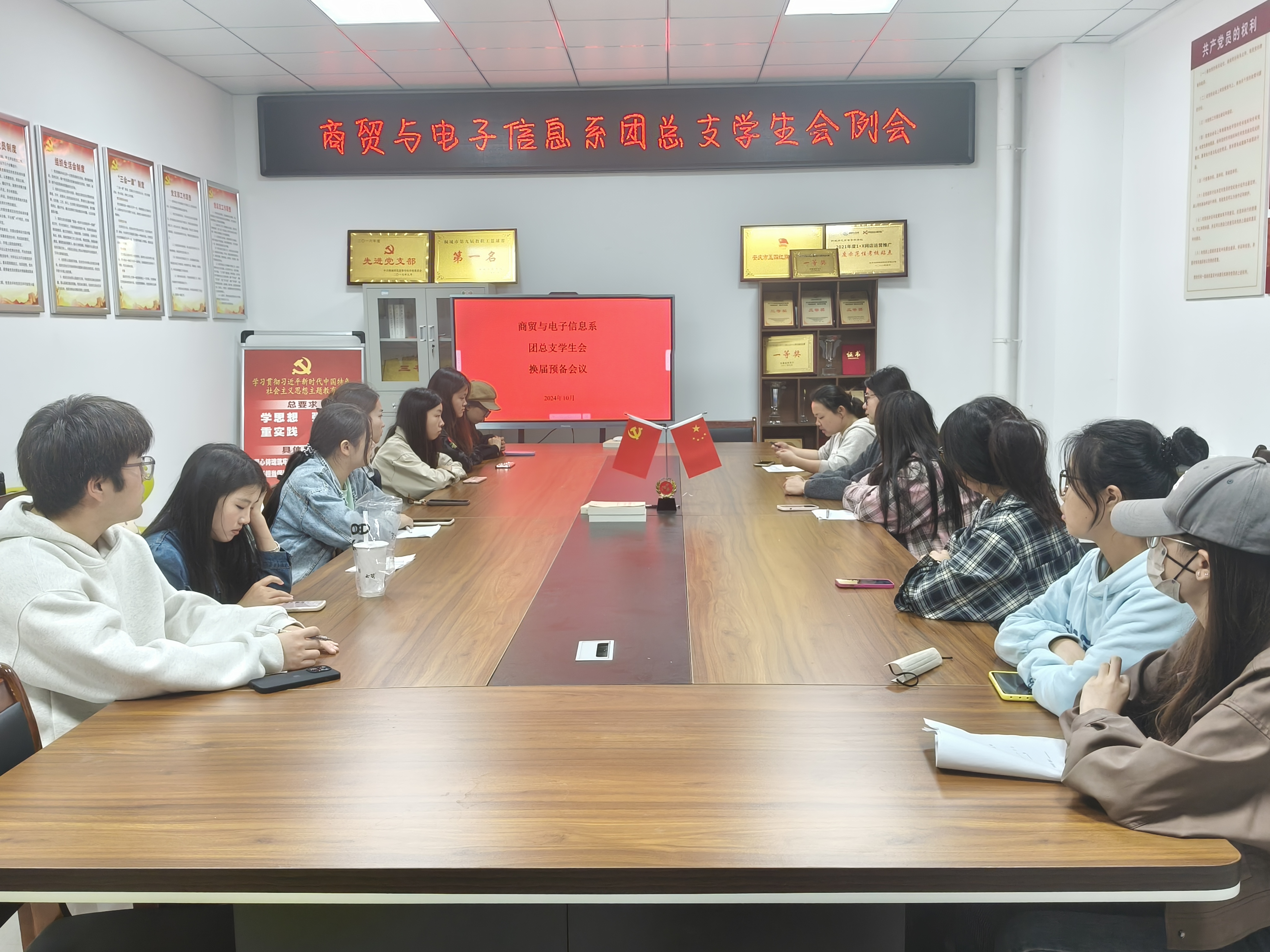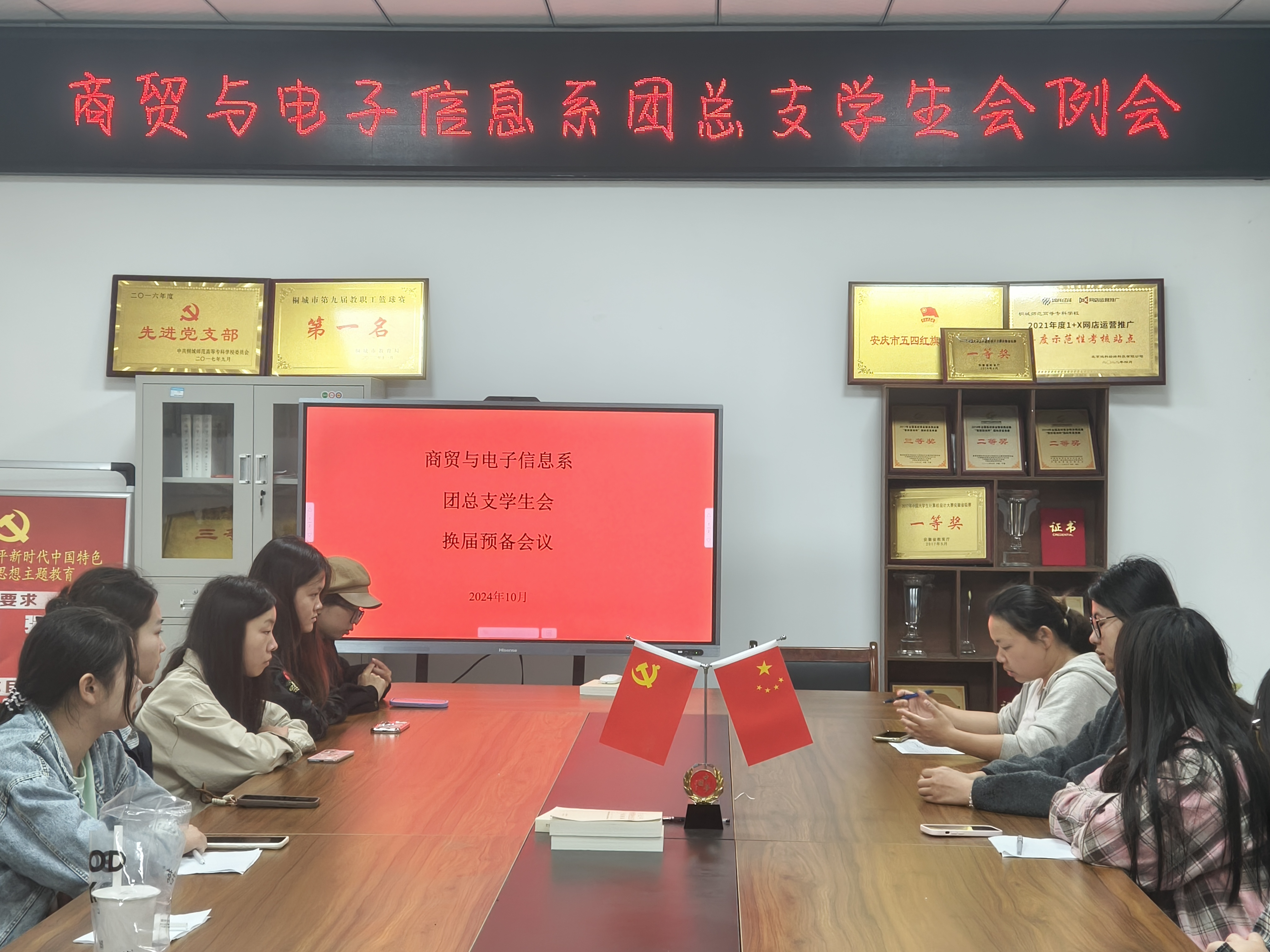 2024 年 10 月 10 日,商貿與電子信息係團總支學生會換屆預備會在毓秀樓三樓商貿係黨員活動室隆重召開。為進一步提升團總支學生會的工作效率和團隊協作能力,並為接下來即將開展的正式會議進行充分準備,係團總支書記胡豔豔和團總支學生會成員們齊聚一堂,共同明確下一步方向及目標,確保換屆工作的順利進行。