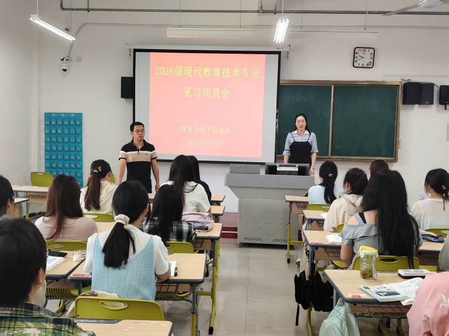 5月9日上午,商貿與電子信息係在毓秀樓202教室召開2026屆現代教育技術專業見習動員會。