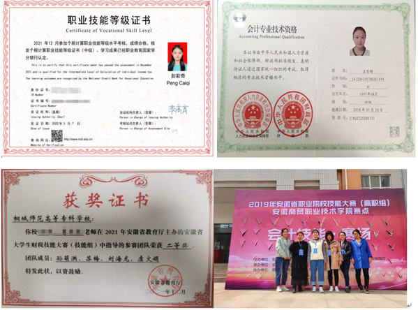 該專業教師團隊是安徽省高水平教學團隊。該專業一直是學校高職類專業的品牌,是最早試點教育部“1+X”證書製度的專業,在全國首次“1+X”個稅計算(中級)考試中取得了100%的通過率,實現了X=3(即一個專業考取三門證書,另外兩門為:金稅財務信息、個稅計算)的考證奇跡,躋身全省院校前列。該專業還有多名同學通過了初級會計師考試,多次獲得國家、省級技能大賽獎項,如全國大學生財稅技能大賽三等獎、安徽省大學生財稅技能大賽二等獎等。