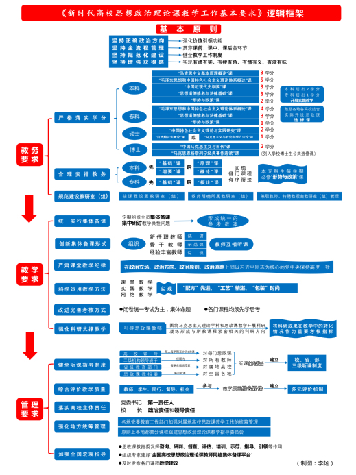 《基本要求》立足規範流程,抓住思政課教學課前、課中、課後等關鍵環節,在操作層麵進一步明確工作要求。從嚴格落實學分、合理安排教務、規範建設教研室(組)、統一實行集體備課、創新集體備課形式、嚴肅課堂教學紀律、科學運用教學方法、改進完善考核方式、強化科研支撐教學、健全聽課指導製度、綜合評價教學質量、落實高校主體責任、強化地方統籌管理、加強全國宏觀指導等十四個方麵作了規定。