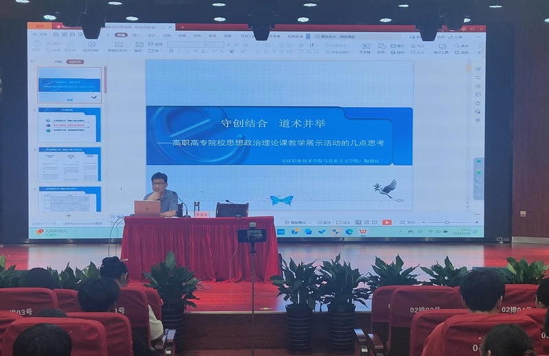 習近平總書記在全國教育大會上指出:“要實施教育家精神鑄魂強師行動,加強師德師風建設,提高教師培養培訓質量,培養造就新時代高水平教師隊伍。”9月29日下午,馬克思主義學院邀請2024年安徽省高校思想政治理論課教學展示活動高職專科《毛澤東思想和中國特色社會主義理論體係概論》課程組特等獎獲得者、安慶職業技術學院馬克思主義學院副教授陶德慶作“守創結合 道術並舉——關於高職高專院校思想政治理論課教學展示活動的幾點思考”專題講座。學院全體教師、全校思政委員和全科學生代表集中在音樂廳全程參與,講座由學院院長雷小麗主持。