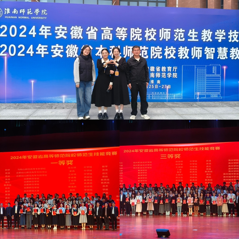 10月26-27日,2024年安徽省高等院校師範生教學技能競賽在淮南師範學院泉山校區圓滿落幕。經過教學設計、課件製作、即席演講和有生上課等環節的激烈角逐,初專2020級學生薑利敏、朱榕芳在思政課教師雷小麗、黃俊、陳超和龍澹寧的指導下參加比賽,分別斬獲一等獎、三等獎。