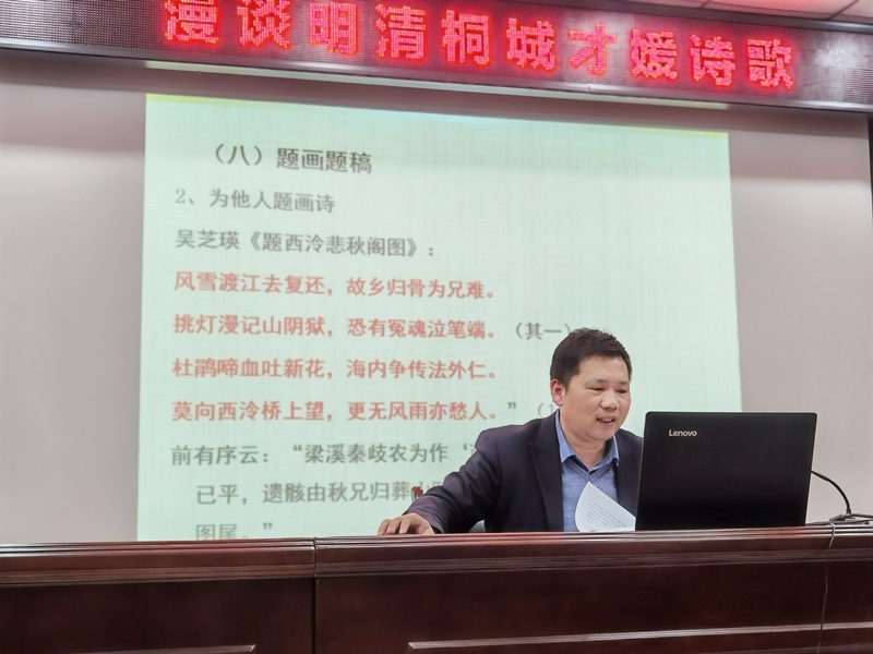 3月28日下午,桐研中心成員開健教授應桐城市圖書館邀請,做客“文都講壇”第67講,在市圖書館三樓多功能廳主講《漫談明清桐城才媛詩歌》。講座由桐城市文化旅遊體育局舉辦,桐城市圖書館承辦。
