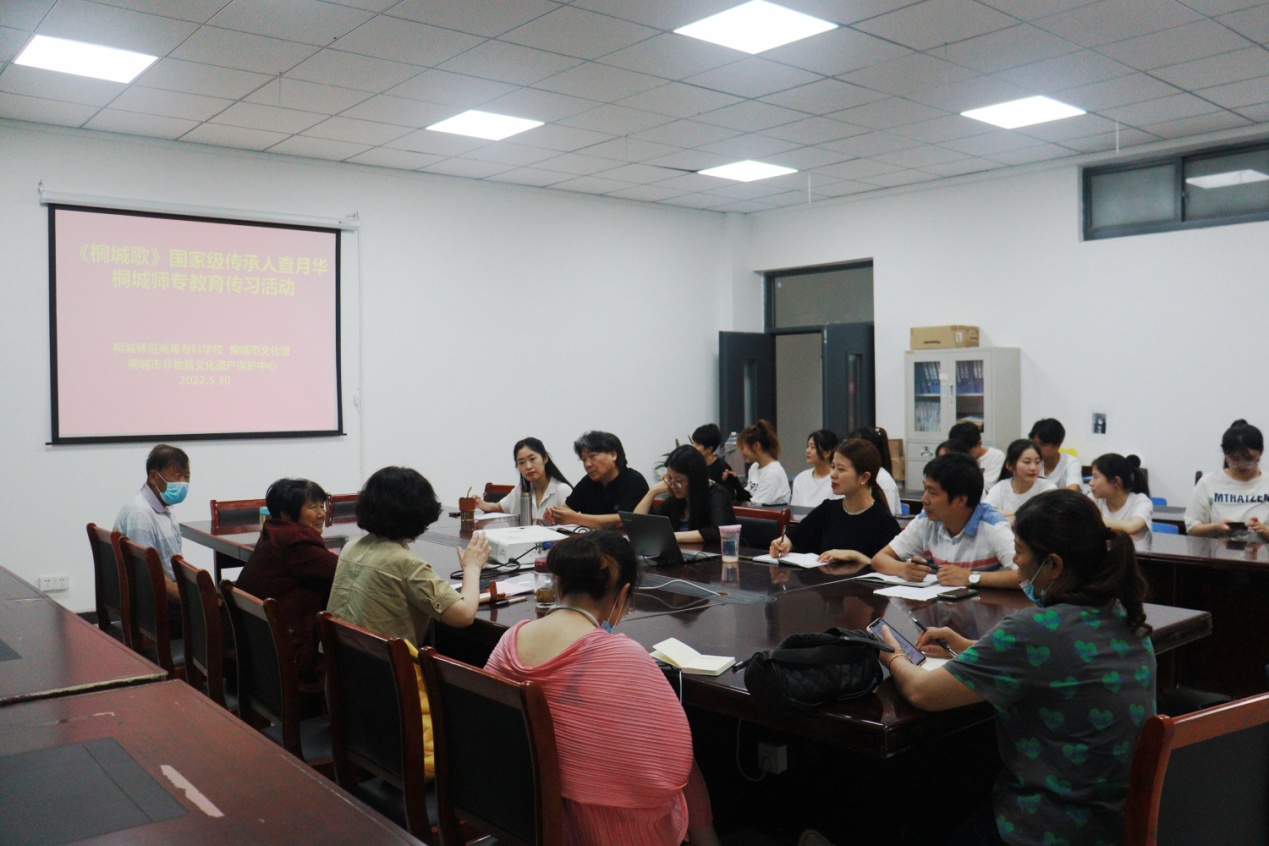 5月30日,學校開展國家級非遺“桐城歌”進校園教育傳習活動,國家級“桐城歌”傳承人查月華,縣級“桐城歌”傳承人江月本,桐城市文化館館長、非遺保護中心主任郭驪一行,我校桐城派學術研究中心負責人陶家韻,藝術與設計係副主任倪甜甜以及部分音樂專業師生參與活動。