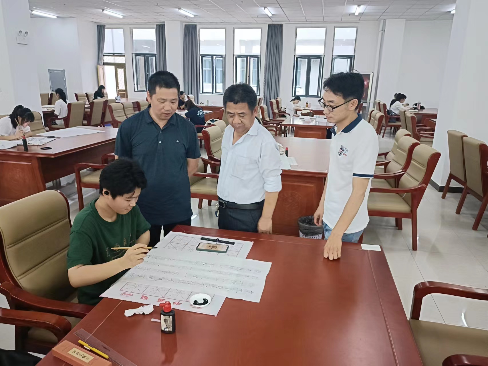 開健、琚詒忠、朱巽華、高寧四位書法教師擔任此次大賽的評委。(唐小晶撰稿 陶家韻審稿)