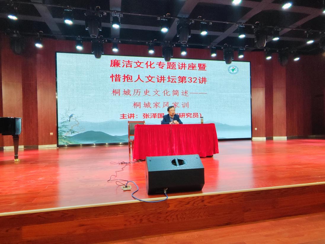 10月24日,學校舉辦廉潔文化專題講座暨惜抱人文講壇第32講,邀請桐城文史專家張澤國副研究館員在演藝廳主講桐城曆史文化簡述——桐城家風家訓,校領導張敏麗、王宏偉、伍建強,各支部委員、部門負責人、思政教師、桐城派研究中心成員以及2022級部分新生現場聆聽講座。桐城派研究中心副主任陶家韻主持講座。