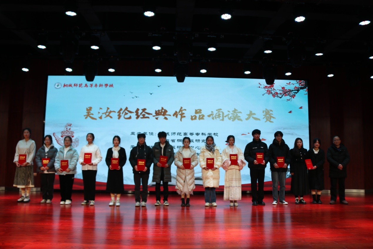 為深入學習貫徹習近平文化思想和習近平總書記在文化傳承發展座談會上的重要講話精神,弘揚中華優秀傳統文化,傳承發展桐城派,構建特色校園文化,豐富學生業餘生活,加強校際交流。12月21日,由桐城師範高等專科學校和安徽省桐城派研究會聯合主辦,安徽省桐城中學,桐城派研究中心,校學生處和校團委共同承辦的“吳汝綸經典作品誦讀”大賽暨“我心中的吳汝綸”征文比賽頒獎儀式在音樂廳舉行。校黨委書記王子龍,桐城市人大常委會主任江學潮,安徽省桐城中學黨委書記、校長曹向東,校黨委委員、宣傳部長伍建強出席儀式並為獲獎選手頒獎。桐城派研究中心、校學生處、校團委和藝術與設計係相關負責人參加活動。
