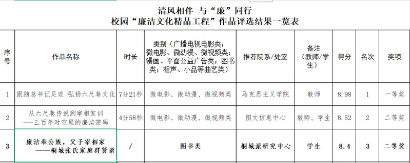 為深入貫徹黨的二十大和二十屆二中、三中全會精神,認真落實習近平總書記考察安徽重要講話精神和二十屆中央紀委四次全會精神,認真落實省紀委監委開展第四屆“安徽廉潔文化精品工程”作品征集展播活動有關安排,根據慶紀辦(2025)11號文件要求和落實省委巡視反饋問題整改工作,校紀委在全校開展“廉潔文化精品工程”作品征集活動,桐研中心選送作品《廉潔奉公族,父子宰相家——桐城張氏家族群賢譜》獲得二等獎。