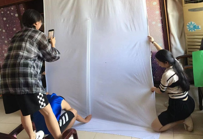 無獨有偶,祝麗霜在做伯努利現象實驗時也遇到了不小的挑戰。她說:“看到這個實驗所需要的材料特別簡單,就覺得這個實驗肯定簡單,沒想到實際操作時遇到這麽多的問題。”如她所料,實驗的確簡單,難在拍攝上麵。拍攝場地很簡陋,而伯努利袋體積過於龐大,在這種情況下想要找到大麵積的幹淨背景無異於癡人說夢。在無法縮小實驗材料體積的情況下,祝麗霜把主意打到了酒店的床單上。說幹就幹,取床單、布景、打光、尋找拍攝角度……一通忙亂下拍攝效果還是差強人意。不甘心,祝麗霜把目光投向窗外,窗外的竹子吸引力她的目光,於是祝麗霜開創性得將竹子作為實驗背景牆,在科宣團成員們得共同努力下伯努利現象這個實驗得到了很好的展現。
