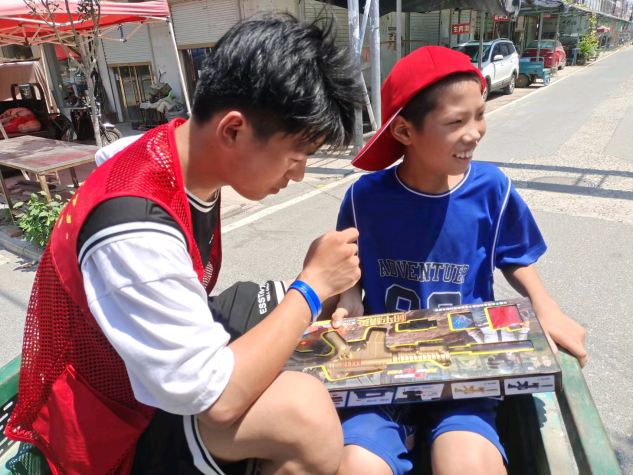 實踐團隊隊員隨後前往他們住的地方,一間老式房屋,家中陳設簡單,沒有空調,唯一的電器隻有一個老式冰箱,雖然簡陋 ,但是還算幹淨整潔。門口的柱子上栓了一隻小貓,據帥帥說,是奶奶帶他在鎮上玩套圈套到的,說完臉上洋溢著驕傲,隊員們也紛紛誇讚帥帥,在與帥帥的聊天中,實踐團隊成員得知帥帥和弟弟想要一個玩具槍,於是便帶領帥帥和弟弟前往鎮上自費購買了兩個玩具槍,看著兩兄弟拿到玩具槍後的喜悅,隊員們也非常高興。