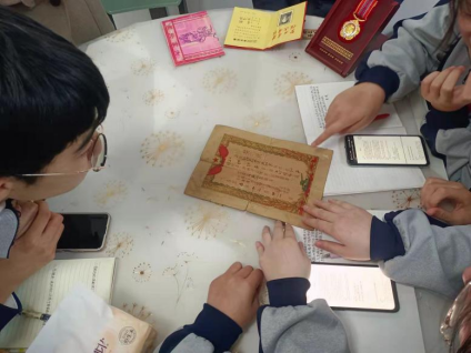 到達吳老家,映入眼簾的就是桌上的獎章和勳章。實踐小組仔細觀摩這些勳章,心靈都受到了非常大的震撼,對吳爺爺滿是敬佩和崇拜。