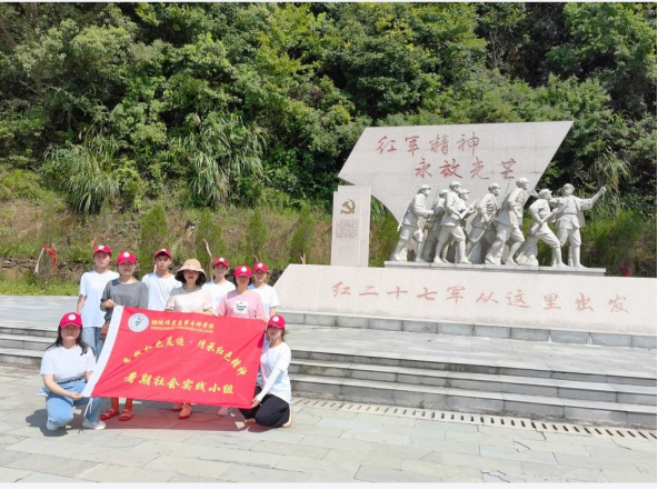 了解了紅二十七軍的誕生和發展後,實踐小組團隊前往紅色文化廣場。廣場主題以雕塑為主,實際上是打造出了紅旗造型,營造出了一種升騰的氣氛,主要是雕塑了十位紅軍將土向著一個方向前進的樣子,象征著革命理想振奮前行的中國共產黨人的堅定信念和革命意誌。