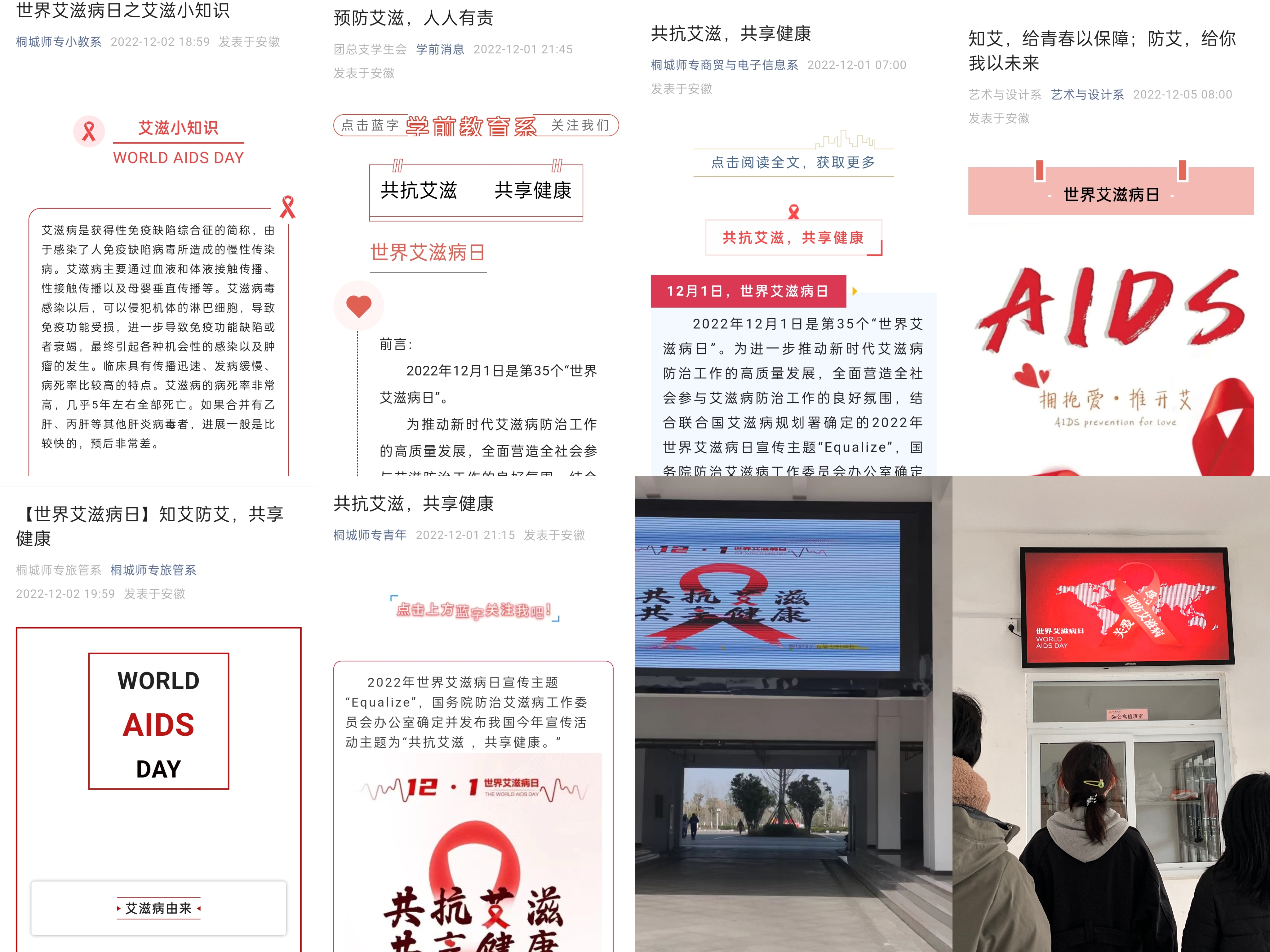 為切實做好“世界艾滋病日”主題宣傳活動,普及預防艾滋病的基礎知識,提升桐城師專師生對艾滋病的正確認識和預防意識,我校通過主題班會、公眾號宣傳、LED標語等多種形式,進一步加深同學們對艾滋病的認識,引起對防艾抗艾的重視。