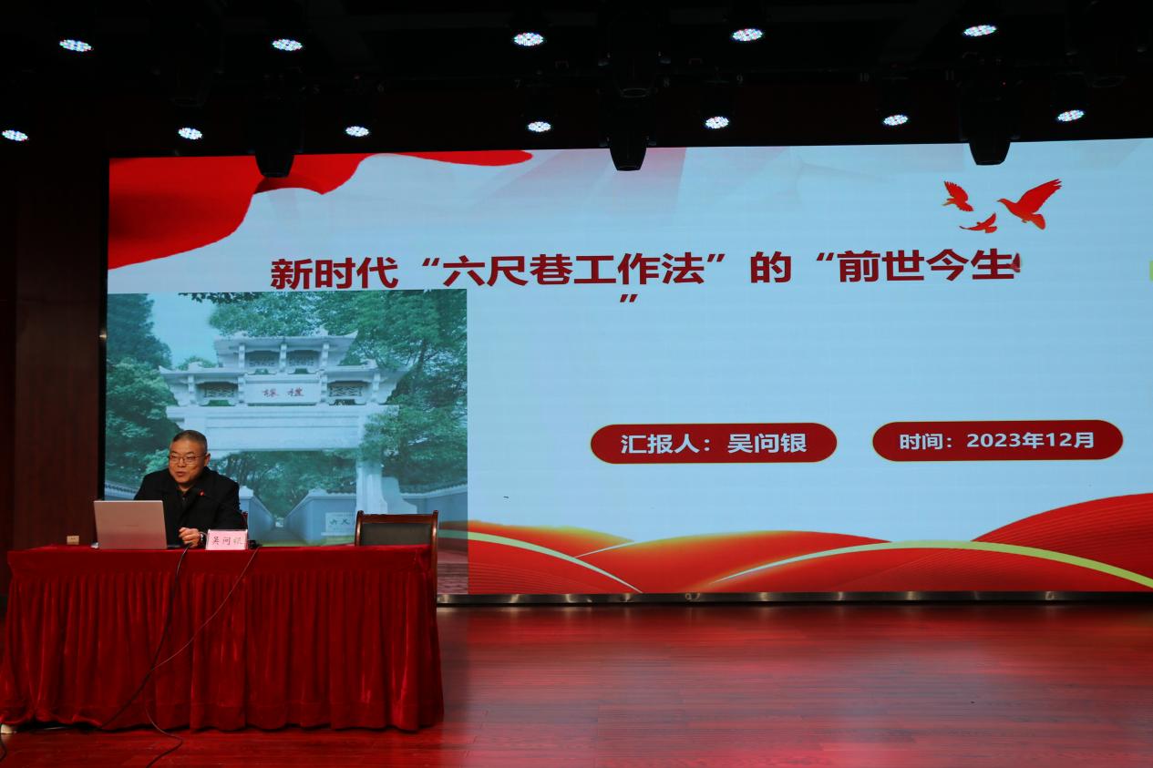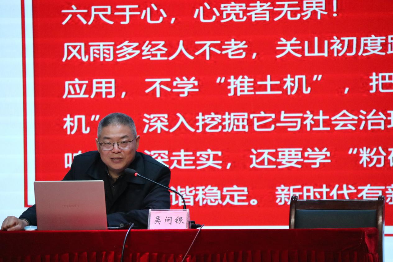 吳問銀首先向同學們介紹了依法治國和以德治國相結合的重要性,然後講解“六尺巷調解法”的基本內涵,“六尺巷調解法”的誕生及成效,詳細解讀了“六尺巷調解法”的“聽,辨、勸、借、讓、和”六字操作規程,並結合典型案例,向同學們闡述了“六尺巷調解法”如何推動矛盾糾紛的實質性化解。最後,吳問銀強調“六尺巷”不隻是一個景點,更是桐城文化的重要載體,“新時代六尺巷工作法”將六尺巷故事蘊含的謙和、禮讓、和諧的精神文化注入基層治理,古為今用,推陳出新,走出了一條源頭治理、多元共治、和諧共享的基層治理之路。