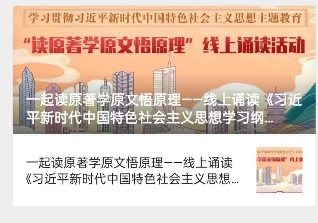 為用更加貼近青年喜聞樂見的方式加強理論學習,開展“讀原著學原文悟原理”線上誦讀活動,在全校範圍內征集《習近平新時代中國特色社會主義思想學習綱要(2023年版)》誦讀音頻,並在公眾號“桐城師專青年”進行優秀作品展播,目前已經開展三期。