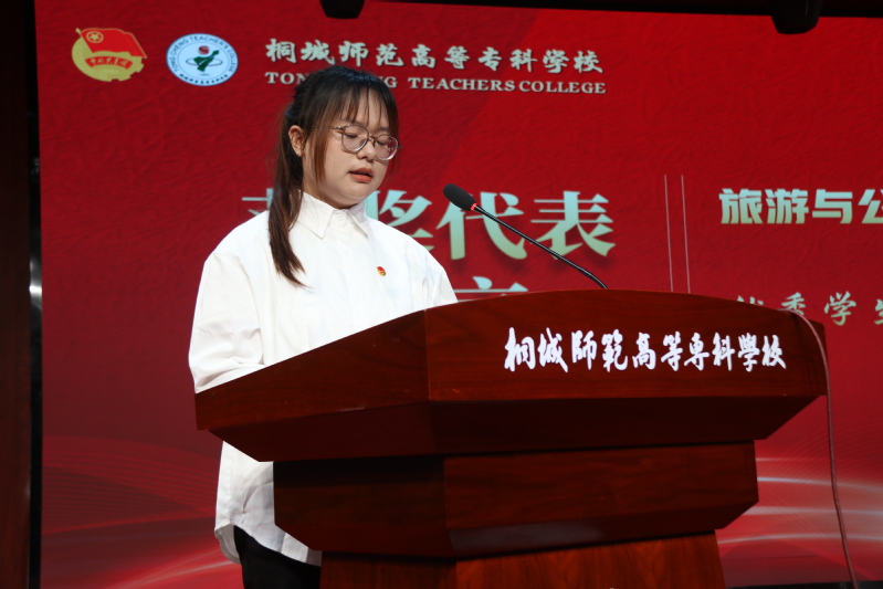大會在雄偉莊嚴的國歌中拉開序幕。校團委書記汪若冰宣讀了“五四”表彰決定,校領導為各項獲獎代表頒獎。五四紅旗團總支獲得者代表商貿與電子信息係團總支書記胡豔豔,優秀學生幹部獲得者代表葉娟娟同學依次上台發言,結合自身工作經曆,交流體悟。
