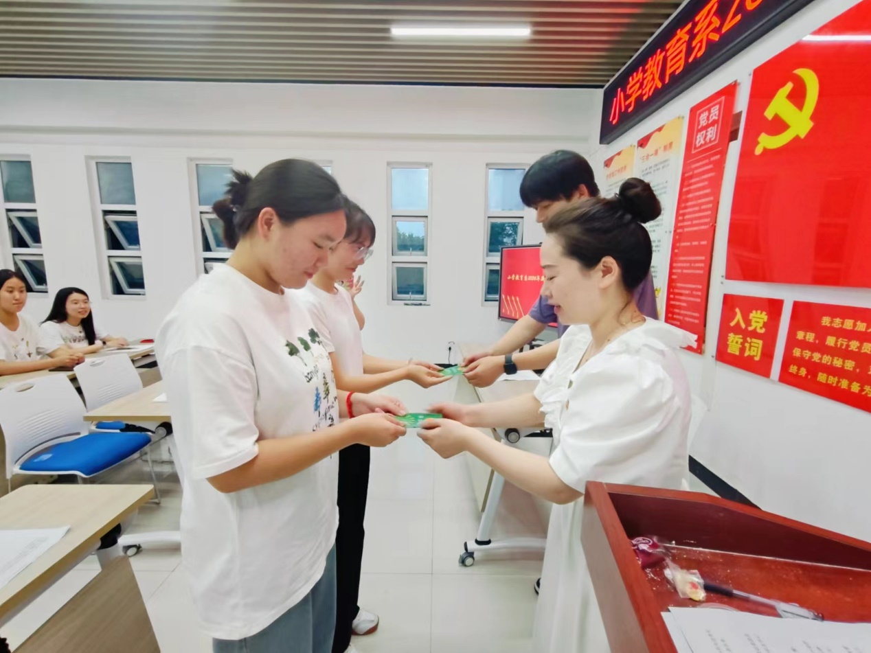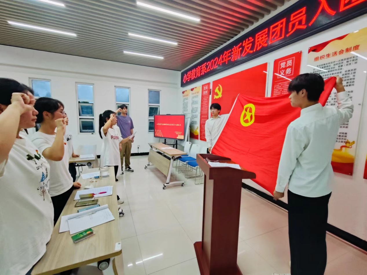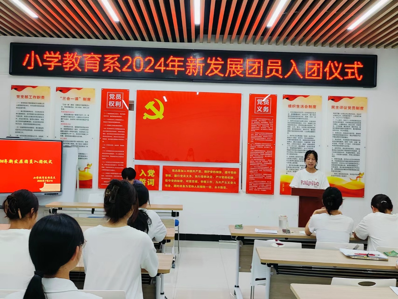 習近平總書記指出,入隊、入團、入黨,是青年追求政治進步的“人生三部曲”。為加強共青團隊伍建設,激勵青年學生樹立團員意識和自覺,堅定不移聽黨話、跟黨走,真正做到思想上入團、行動上入團、組織上入團。7月3日晚,小學教育係在一站式學生社區舉行了2024年新團員入團儀式。小教係學生黨支部組織委員郭曉瑋老師、小教係2024年新發展團員、優秀團員代表共同參加。儀式由小教係團總支書記程蓉蓉主持。