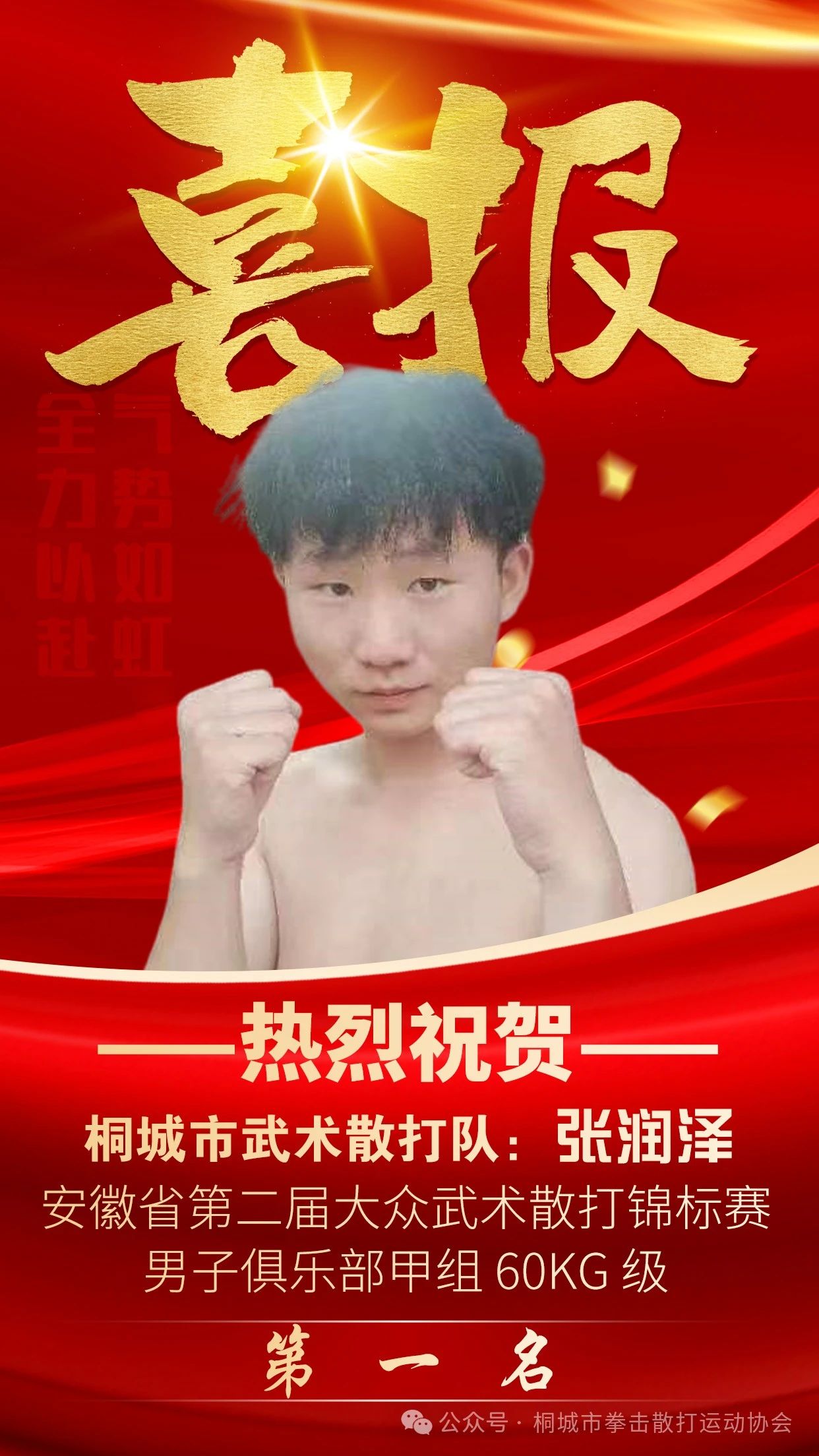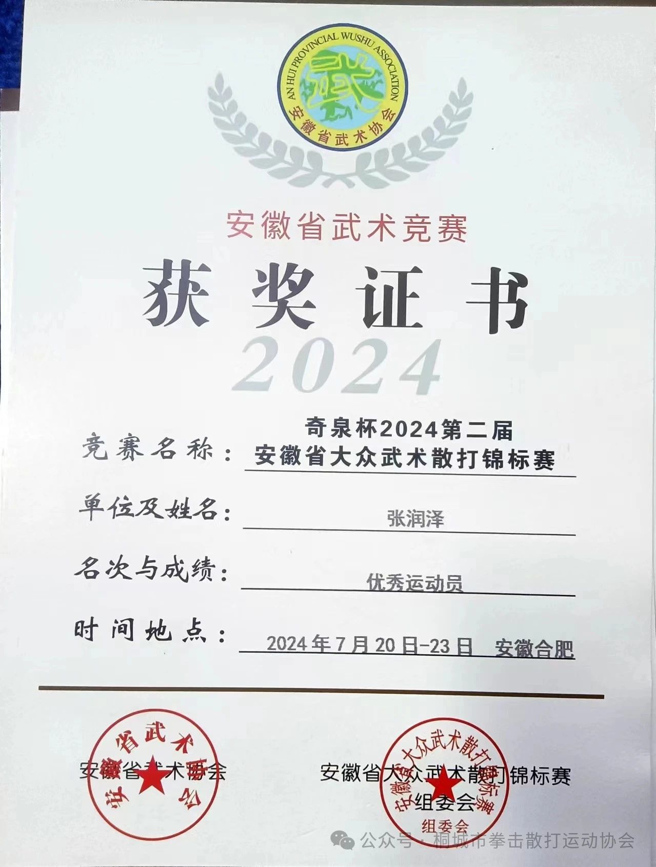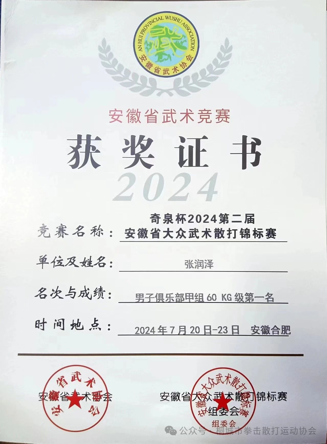 723日下午,“奇泉杯”2024第二屆安徽省大眾武術散打錦標賽在安徽藝術學院舞蹈樓完美收官。來自桐城師範高等專科學校武術協會的張潤澤同學憑借著出色的技巧、頑強的毅力和堅定的信念,力挫群雄,勇奪男子俱樂部甲組 60kg 級第一名的佳績,並榮獲“優秀運動員”的榮譽稱號。