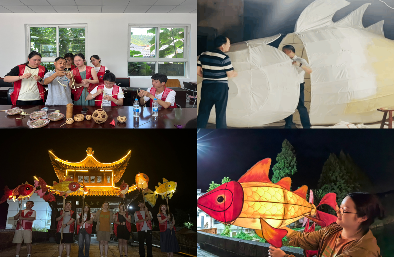 齊聚胡樂聖地,賞悅非遺魚燈。86日,周海平老師帶領團隊成員了解胡樂“魚燈”的文化脈絡、構成及製作方法,並示範了魚燈從框架搭建、上漿粘貼等過程需要注意的細節和技巧,成員認真觀察學習,利用竹篾、白膠、畫布等材料,耐心地編織纏繞魚燈框架,依次完成捫上畫布、脊骨嵌燈、上色繪染等工序,一筆一畫地將寓意豐富的構思勾勒在“魚燈”上,描繪出對美好生活的祝願。87日,為了讓團隊成員更全麵地了解“魚燈”,當地對接人袁雨晴老師親自展示了舞蹈動作以及表演方式,並邀請大家參加“魚燈”夜行活動,團隊成員認真學習動作後,手持魚燈“遊”上古街,數盞小魚燈環繞大魚燈穿梭於街巷,歡聲笑語此起彼伏。