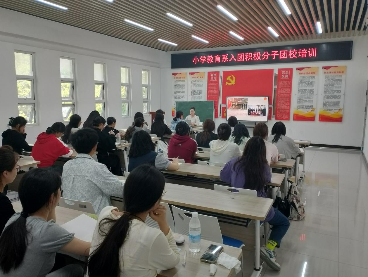為深入學習貫徹習近平新時代中國特色社會主義思想和黨的二十大精神,進一步加強青年的思想引領,提升團組織的凝聚力和戰鬥力,小學教育係團總支4月18日在一站式學生社區,開展了一堂主題鮮明、內容豐富的團課培訓。本次團課由小學教育係團總支書記程蓉蓉主講,全體入團積極分子參與,培訓現場氣氛熱烈而莊重。