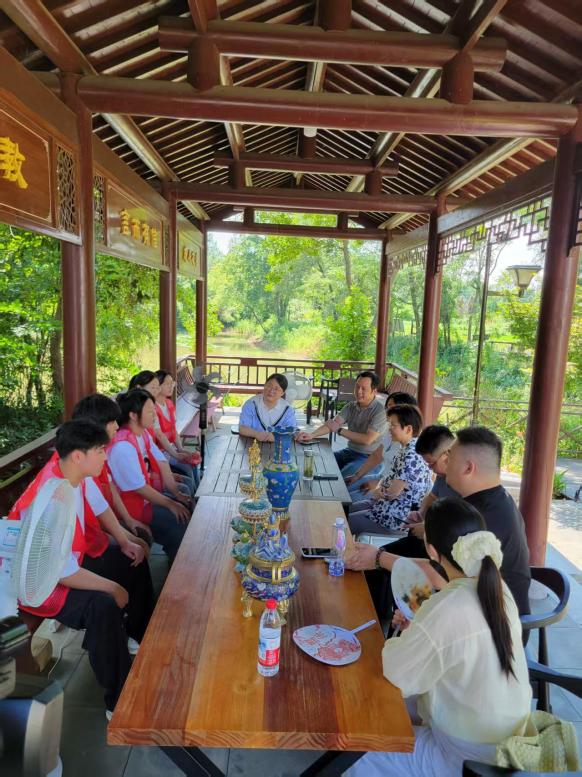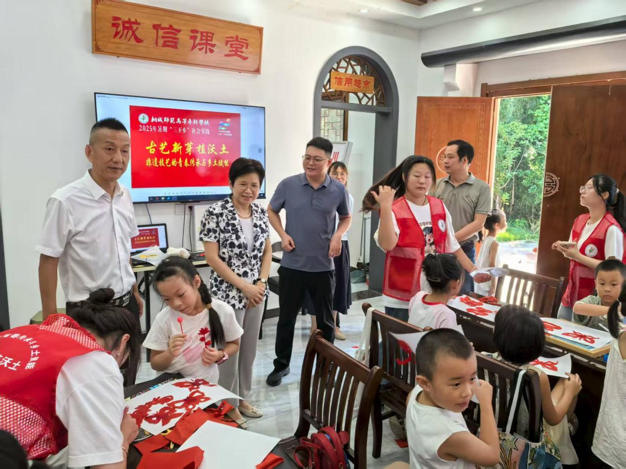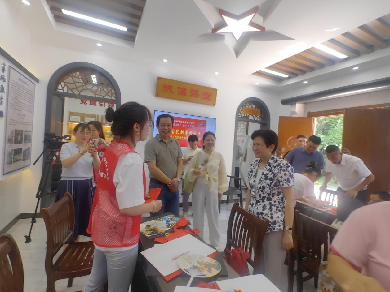 7月30日上午,校黨委副書記張敏麗帶隊前往桐城市嬉子湖鎮裁襟勵子文化園,看望慰問在此開展暑期“三下鄉”社會實踐的“古藝新芽植沃土——剪紙、琺琅非遺技藝的青春傳承與鄉土賦能”團隊師生,並與大家親切座談,深入了解實踐進展,給予關懷與鼓勵。藝術與設計係主任周琳、校團委書記汪若冰、團委副書記、小學教育係黨總支副書記胡二慶和藝術係黨總支副書記倪甜甜陪同。嬉子湖鎮黨委組織委員吳群熱情接待了一行人。