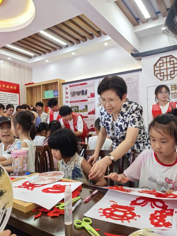 張敏麗一行實地觀摩了團隊活動開展情況。實踐團隊圍繞“傳承、賦能、記錄”核心目標,精心組織了內容豐富的非遺實踐活動。在“非遺大講堂”上,團隊通過圖文展覽、實物展示結合傳承人現場演示,係統地向當地青少年講解剪紙與掐絲琺琅的曆史脈絡及工藝價值,並設置了非遺知識競答、紋樣拚圖遊戲等趣味環節,現場氣氛熱烈。