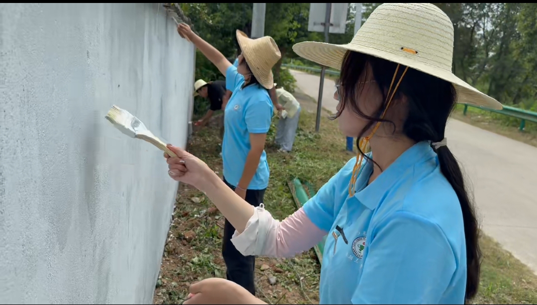 正午的合河村,熱浪翻湧。村委會休息室內,隊員們趴在會議桌上短暫休整,被汗水浸透的衣衫緊貼著椅背,沒有抱怨,隻有擰緊水瓶的窸窣聲——快些修整,下午還有半麵牆等著上色。這群平均年齡不到二十歲的娃娃兵已在高溫下炙烤了數日,早上六點爬起,頂著晨曦踏入鄉野,七點收工,攜著漫天星光踏出村莊。“很心疼,但更多的,是為他們驕傲”!指導老師王辰銘在和村支書的交談中發自肺腑地感歎。