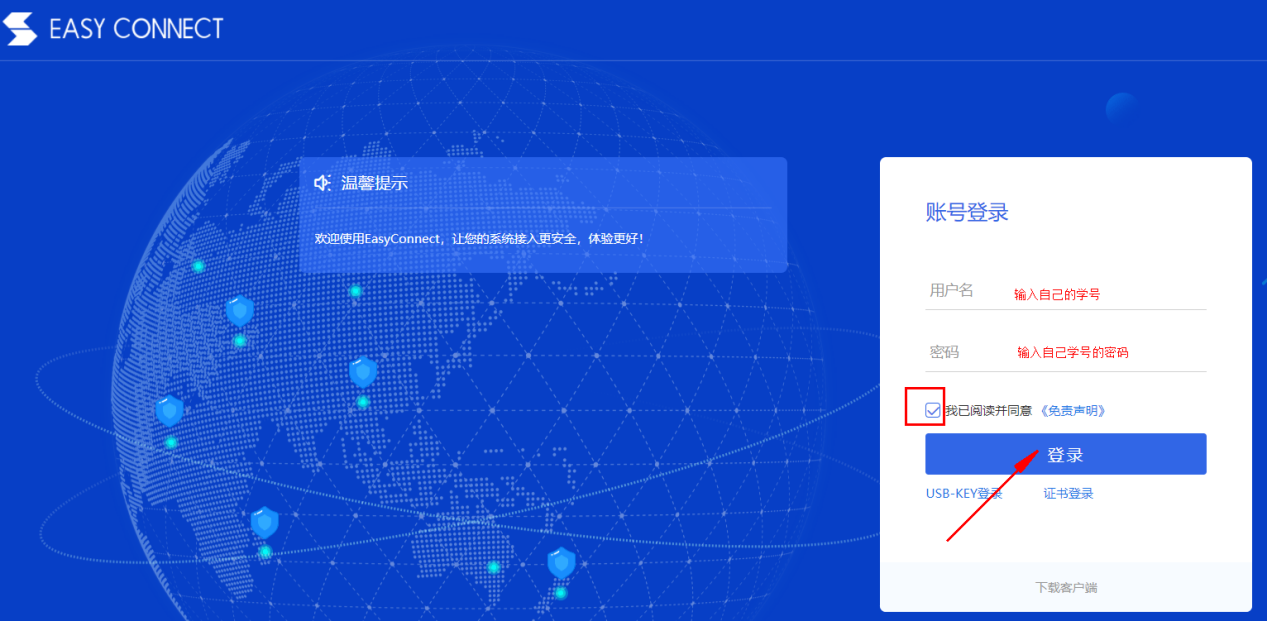 打開頁麵如上所示,輸入自己的學號/工號和密碼(同校園網登錄認證賬號密碼相同),勾選同意點擊登陸即可登陸校內vpn。