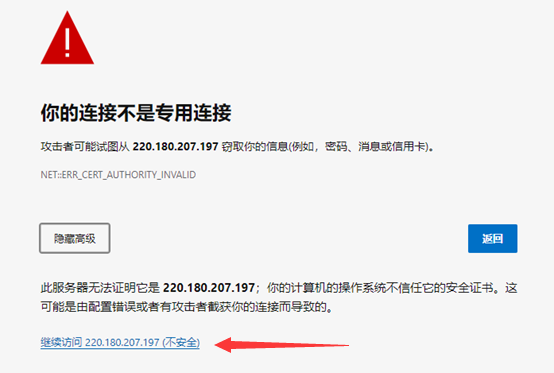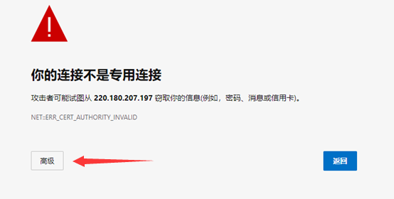 出現如下頁麵,先點擊高級,展開後再點擊繼續訪問。