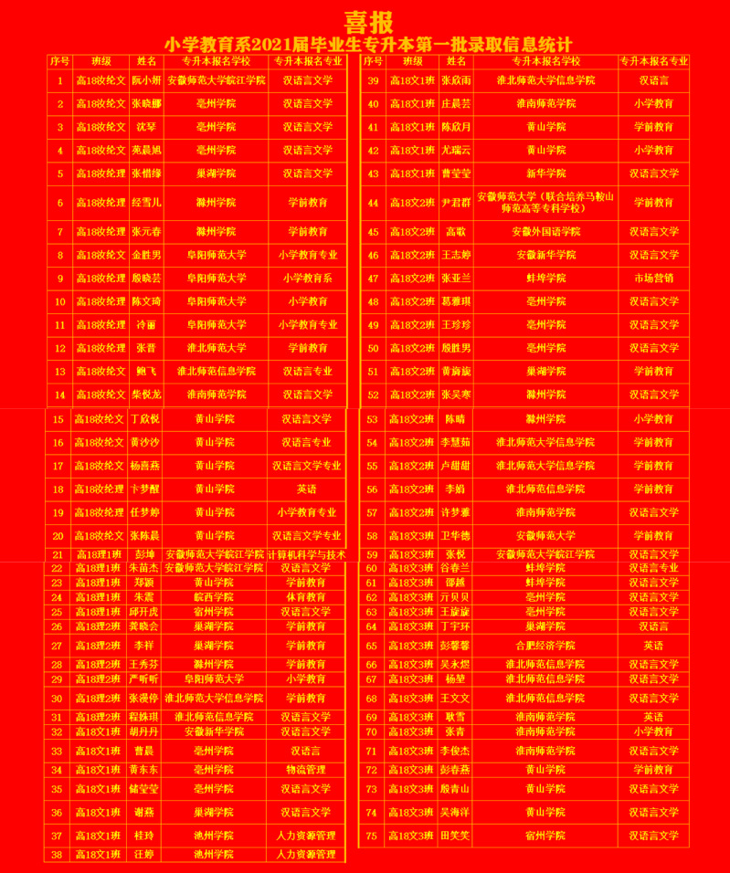 2021年小教係高專18級專升本第一批錄取人數已發布!後續還有調劑!截止到5月25日上午,已有75人被錄取(含汝綸班20人)一共107人報考專升本!目前錄取率達70%!恭喜各位同學!2021年專升本各專業首輪錄取數據附件:小學教育係2021屆畢業生專升本第一批錄取信息統計.xlsx