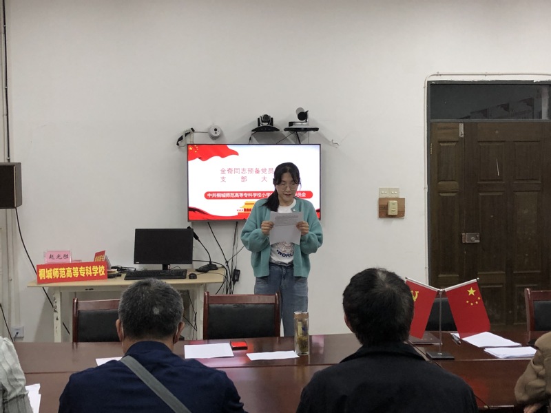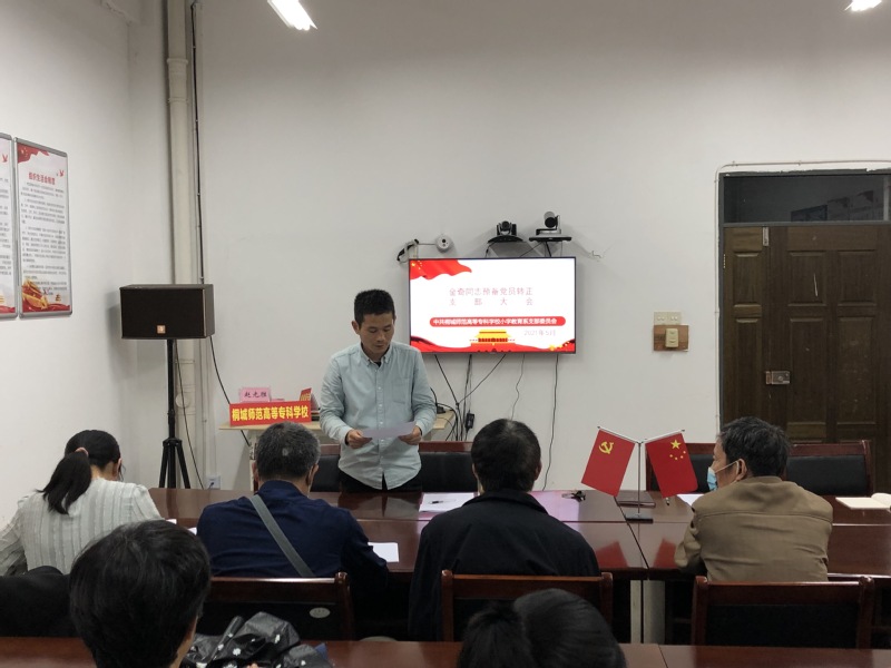 三是支部委員會介紹金奇同誌預備期間的教育考察情況。殷海紅副書記代表小學教育係黨支部支部委員會,對金奇同誌在預備期間的教育和考察情況向支部大會作了匯報,並向支部大會傳達了支委會成員同意金奇同誌按期轉正的支委會決議見,請支部大會審議該決議。