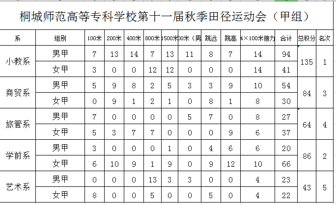 經過兩天的奮力拚搏,在係師生共同努力下最終我係以135分的總積分取得團體第一名的好成績並在拔河團體賽中亞軍的好成績