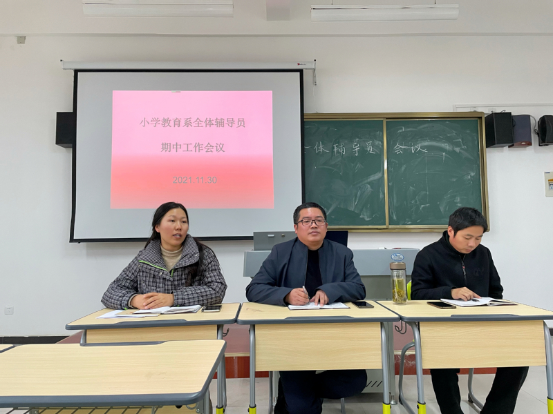 11月30日下午,小學教育係在毓秀樓206教室召開了2021—2022學年度第一學期全體輔導員期中工作會議,係主要負責人方皓文、教學副主任陶家韻及全體輔導員參加會議。學管副主任雷小麗主持會議。