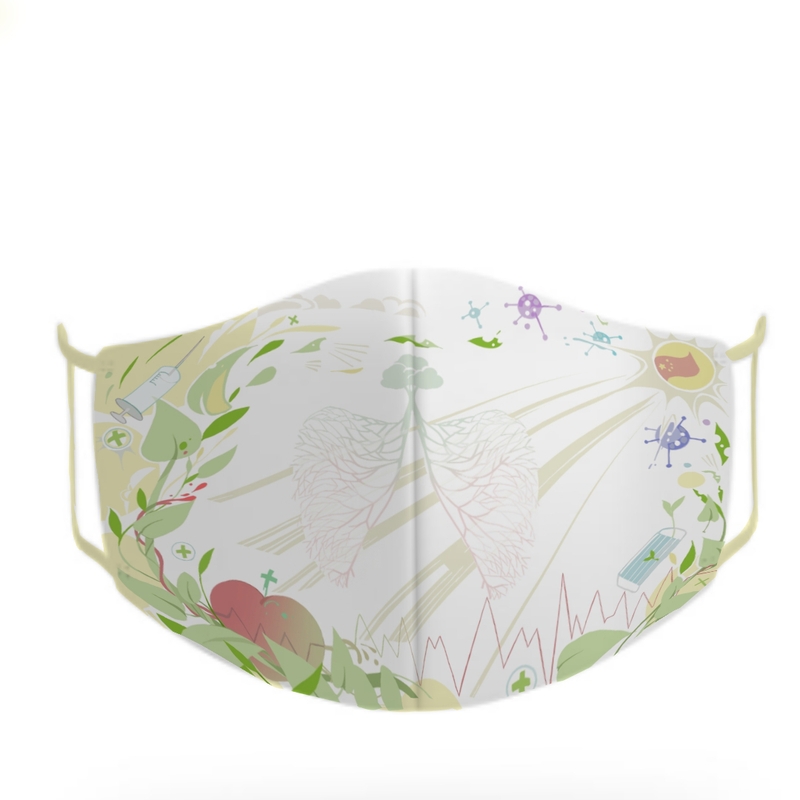 設計理念: 這次口罩表麵圖案設計,我參賽的作品叫《生命綠藤》,本圖以黃綠色為主色調,渲染著陽光青春的氛圍,圖中四周以綠色植物為主圍繞著肺,還有陽光,病毒,口罩,治療,國旗,肺,心,針管等元素。 本次主題中有生命至上,共享健康等。我的想法是,綠色代表健康,一路向上生長的綠藤代表著健康,同時它們向著太陽生長也代表著生命頑強不息。在綠藤裏麵生長著一顆心,這顆心代表著心髒,連接著心電圖和綠藤纏繞著,互相依靠,互相幫助代表著生生不息,它們和陽光並肩作戰共同消滅病毒,而靠近病毒的枝葉被摧殘但是仍然繼續向前,保護著肺,象征著抗疫人員,在太陽中有著國旗,代表著全國,陽光普照全國人民,守護所有人,這就是我的設計理念。