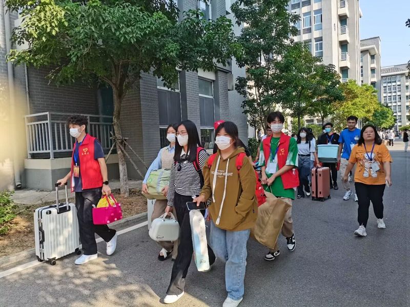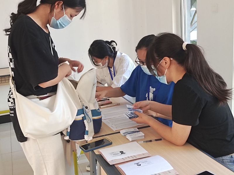 在校門口的迎新地,新生出示核酸證明及安康碼後入校,我校誌願者將新生的行李搬運到來接的大巴車上,在誌願者的帶領下前往六號宿舍樓進行核酸檢測;緊接著前往各個專業地點進行報道,每個報道點都有相應的老師負責,並有誌願者從旁協助老師,方便了各位新生能盡快完成報到手續的辦理;最後由誌願者將行李搬至對應的宿舍。誌願者不懼酷熱,熱情為新同學服務,大力發揚了誌願者無私奉獻的精神。