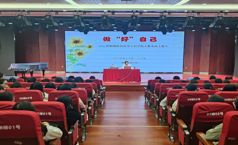 小教係深入貫徹落實習近平新時代中國特色社會主義思想,推進主題教育走深走實,同時為了更好落實立德樹人根本任務,培養德智體美勞全麵發展的社會主義建設者和接班人,踐行我校五大育人工程中的“榜樣引領”育人示範作用,幫助2023級新生盡快適應新的學習環境、樹立人生奮鬥目標激發其奮發向上向善的學習熱情助其養成良好學習習慣和淬煉持之以恒的學習毅力,10月15日上午,在校音樂廳,小學教育係特盛情邀請了我校98級優秀學子,現為懷寧縣稼先學校的副校長汪玉燕,舉辦了題為“做‘好'自己——桐城師專小教係高專新生”的勵誌報告活動。報告會由小學教育係兼思政部副主任雷小麗主持,小教係全體23級高專新生386人聆聽了勵誌報告。