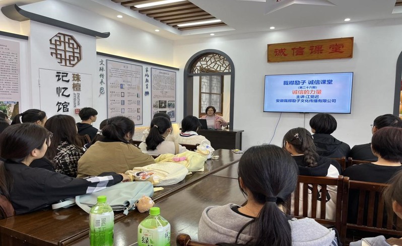 活動中,江覺遲老師首先向同學們介紹了“裁襟勵子”的故事,感受蘇蕙華教育孩子:“一要尊師重教,二要言而有信,三要成人之美,一襟而全三教”尊師重教的傳統。隨後,江覺遲老師帶領大家參觀裁襟勵子文化園:蘇蕙華故居,桐城母教長廊,裁襟勵子非遺館,誠信圖書角等等,讓大家零距離感受非遺文化,接受優秀傳統文化的熏陶。最後全體同學與江覺遲老師合影留念。