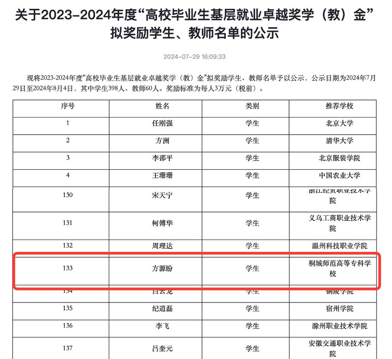| 喜報——桐城師專小學教育專業畢業生方源盼獲2023-2024年度“高校畢業生基層就業卓越獎學(教)金” |