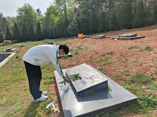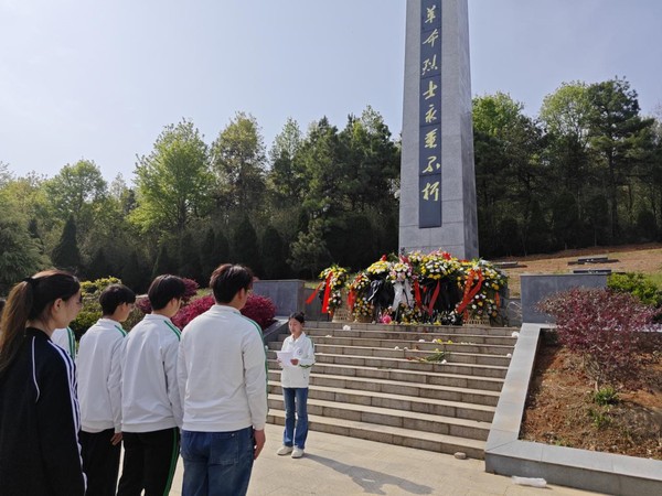 最後,同學們手持鮮花,懷著崇敬的心情,依次向革命先烈敬獻鮮花,環碑瞻仰烈士紀念碑。在烈士的墓碑前,王軍路同學的彎腰弧度和雙手獻花,深深的表達了他對革命先烈的崇高敬意和深切緬懷。