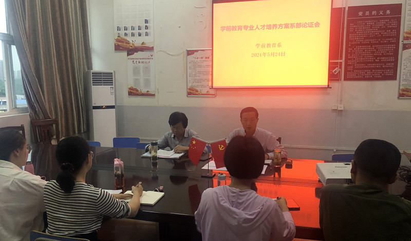 為進一步推動學前教育專業的內涵式發展,有效契合學前教育專業認證工作的相關要求。根據《教育部關於職業院校專業人才培養方案製定與實施工作的指導意見》(教職成【2019】13號)和學校《關於製訂2021版人才培養方案的通知》文件精神,學前教育係於5月24日晚在毓秀樓6樓會議室召開了學前教育專業人才培養方案(2021版)係部論證會。程躍文主任、學前教育教研室骨幹教師、各專業帶頭人參加會議,會議由教學副主任曹杏田主持。