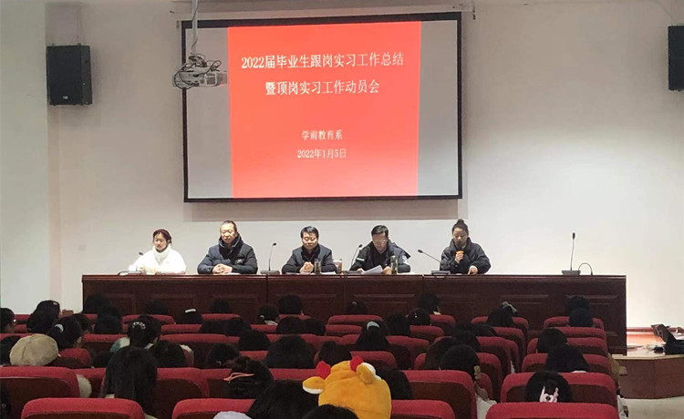 1月5日下午學前教育係2022屆畢業生跟崗實習工作總結暨頂崗實習工作動員會在其昶樓報告廳舉行。係黨支部書記、主任程躍文,副主任黃學虎,畢業班輔導員方健、王辰銘,部分專業教師出席會議。全體畢業班同學參加會議。會議由副主任曹杏田主持。