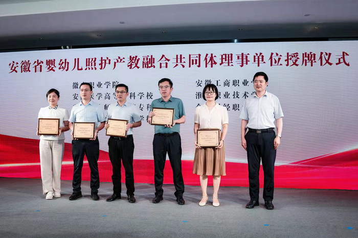 論壇發起成立安徽省嬰幼兒照護產教融合共同體,經過層層遴選和評估,我校被授予安徽省嬰幼兒照護產教融合共同體“常務理事單位”,共同體將為所有成員單位搭好平台、促進溝通、做好服務,發揮橋梁作用,共同體成員單位還將共享實習就業崗位資源,共建規範化建設標準,服務於安徽省嬰幼兒照護服務行業人才培養。