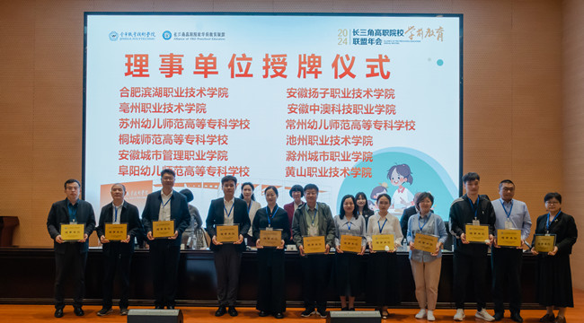 4月25日,2024年長三角高職院校學前教育聯盟年會在金華職業技術學院召開,我校被授予理事單位。校黨委委員、副校長王宏偉帶隊,學前教育係係主任曹杏田等參加年會。