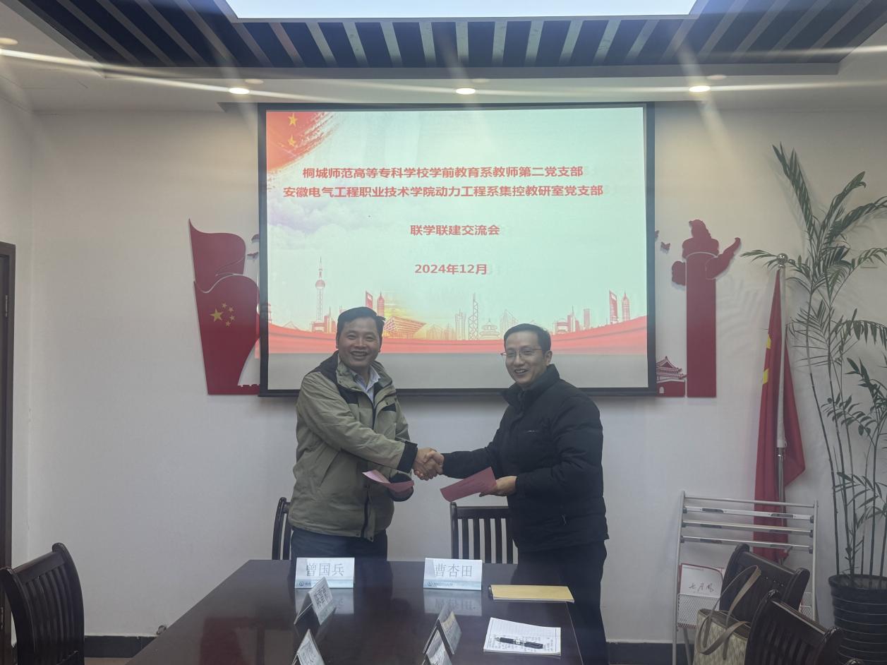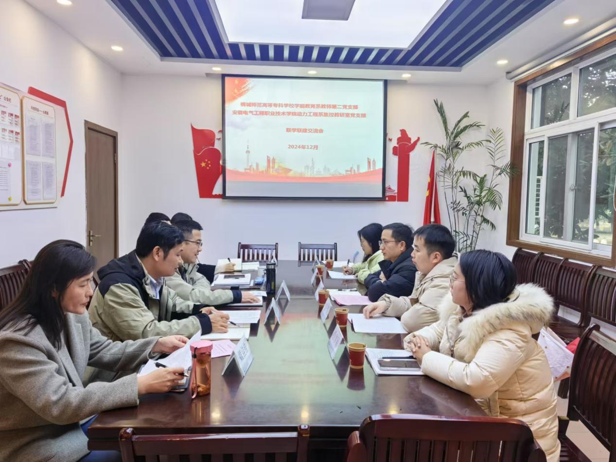 為深入推動高校“雙帶頭人”教師黨支部書記“強國行”專項行動,1212桐城師範高等專科學校學前教育係教師第二黨支部與安徽電氣工程職業技術學院動力工程係集控教研室黨支部攜手,開展聯學聯建活動。安徽電氣工程職業技術學院動力工程係黨總支書記吳義純、係主任周柏鬆、集控教研室黨支部書記曾國兵、教研室黨員代表,桐城師專學前係教師第二黨支部書記曹杏田及黨員代表參加。