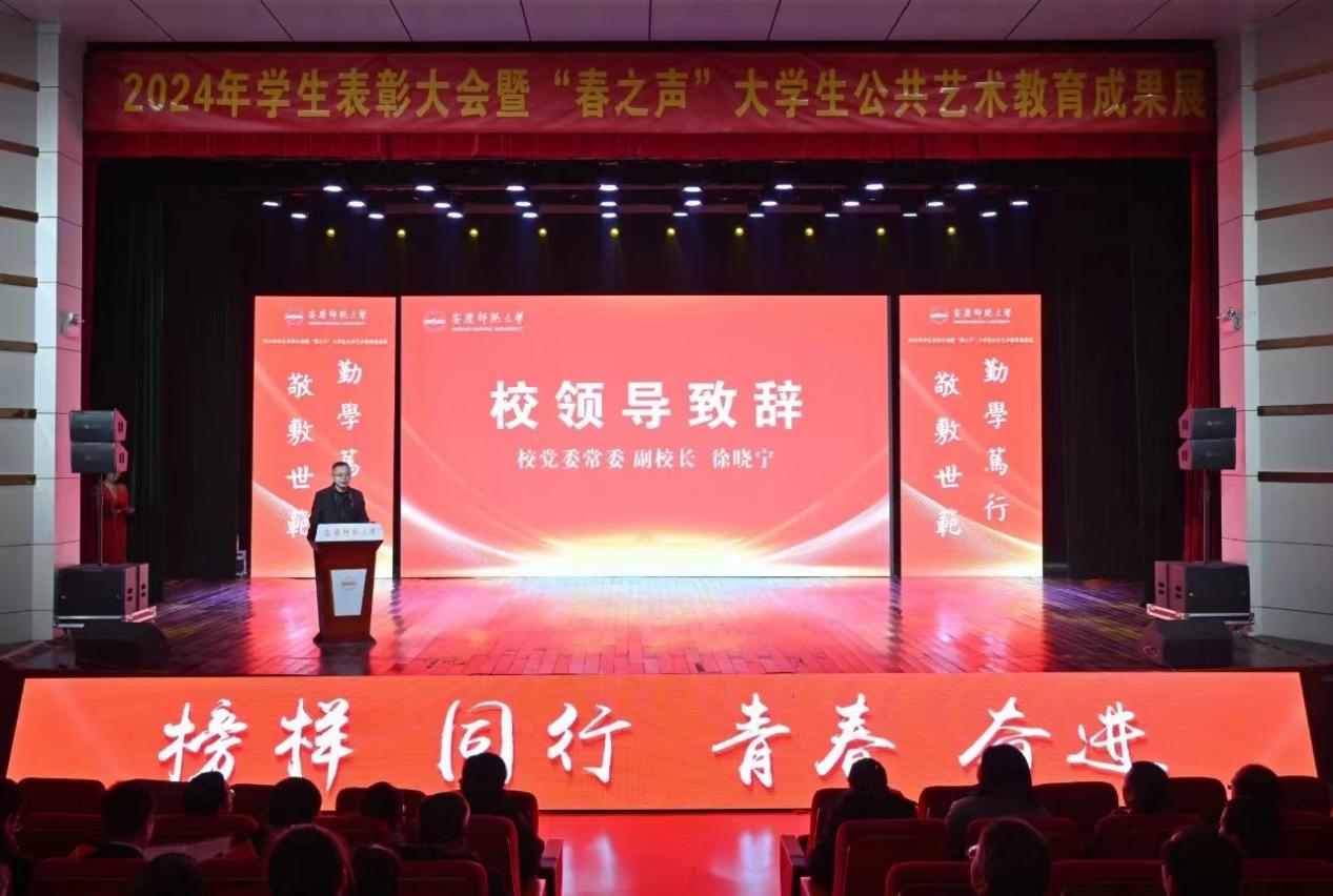 表彰開始前,安慶師大校領導向受表彰的先進集體和個人表示祝賀,向潛心育人、辛勤培養學生成長成人成才成功的教職工表示感謝。他指出,2024年,全校各級學團組織、幹部、教師深入貫徹黨的二十屆三中全會精神,深入學習貫徹習近平總書記考察安徽重要講話精神,緊扣立德樹人根本任務,努力建設高水平的人才培養體係,在思想引領、學習實踐、文體藝術、創新創業等方麵取得了豐碩的成果。他勉勵青年學生要堅定信念,在錘煉品德中凝聚奮進力量;要吃苦耐勞,在火熱的實踐中練就過硬本領;要擔當作為,在篤信篤行中磨礪成長。