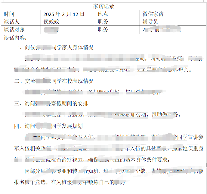 寒假期間,學前教育係組織輔導員、班主任成立專項工作小組,對家庭經濟困難學生、學業困難學生及偏遠地區學生開展“一對一”線上家訪活動。通過視頻連線、語音通話、短信了解等方式,老師們深入了解學生家庭實際情況,向家長反饋學生在校表現,詳細講解助學貸款、國家及校內獎助學金等政策,並針對性製定幫扶計劃。家訪覆蓋累計連線學生家庭50餘戶,一位家長感動地表示:“感謝學校一直惦記著孩子,不僅提供經濟支持,更給了关键词2全家戰勝困難的信心”。