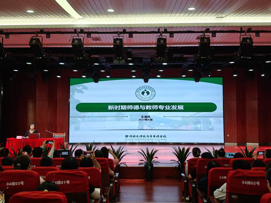819午,徐州幼兒師範高等專科學校王清風教授應邀來校,在音樂樓音樂廳為2025年安慶市“安心托幼行動”暨幼兒園教師提升培訓班學員做新時期幼兒園教師職業道德與教師專業發展的主題講座講座桐城師範高等專科學校學前教育係主任曹杏田主持