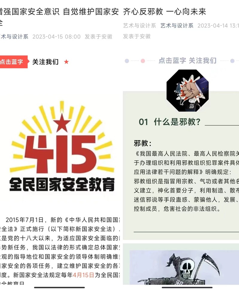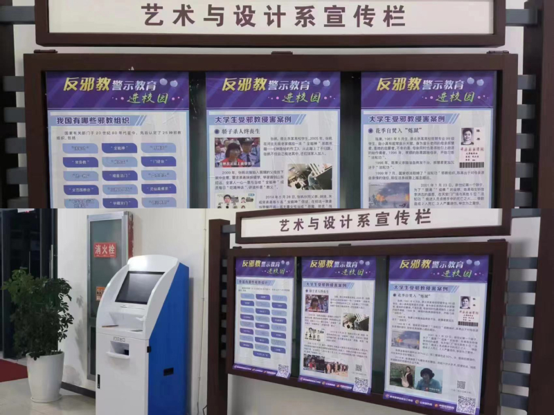 無“邪”青春 盛放國家安全之花。各係組織學生開展反邪教警示教育,觀看警示教育宣傳片,同時引導師生關注“中國反邪教”微信公眾號。藝術與設計係在教學樓布置了反邪教主題宣傳欄,一幅幅主題鮮明、內容豐富的宣傳資料和案例,吸引了師生們駐足閱覽。此次警示教育項目,使學生自覺抵製邪教侵蝕,營造了濃厚的反邪教校園氛圍,提高師生防範邪教的能力。