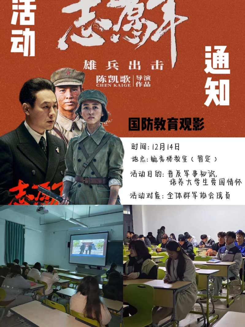 12月14日,軍事愛好者協會組織會員觀看愛國電影《誌願者之雄兵出擊》,生動向大學生普及國防知識,培養愛國主義精神和國家榮譽感,增強國家凝聚力和主權意識。